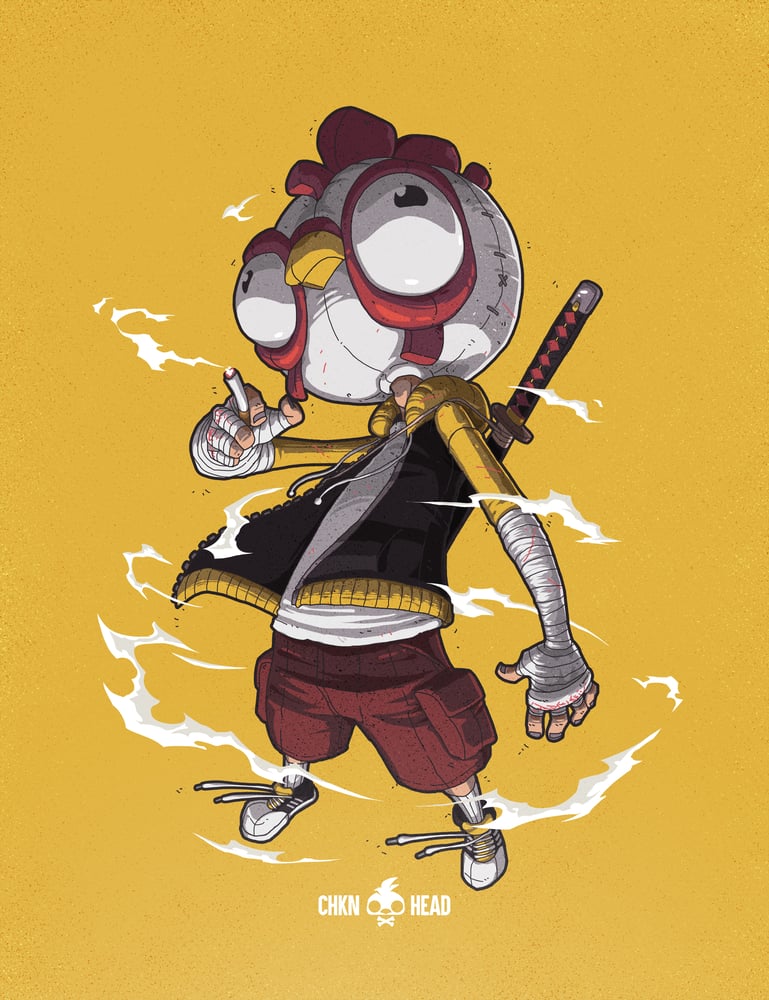He is just a normal dude turned assassin who covers his head with a Stuffed chicken mask. As a tribute to his pet chicken who was murdered in front of him by the Notorious Chicken Killer "The Colonel"